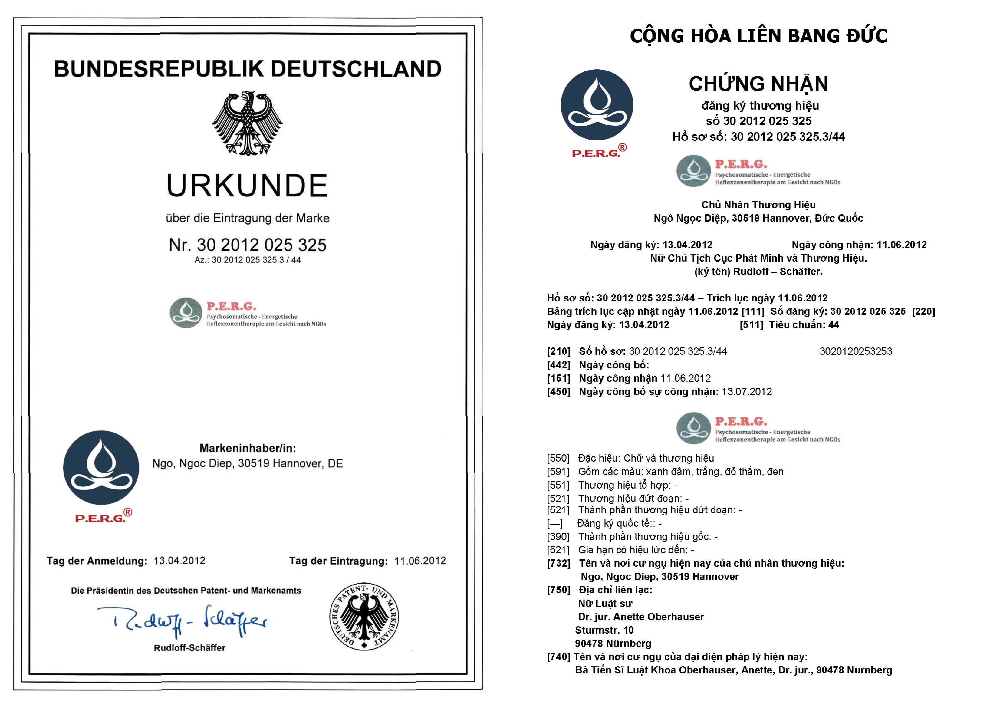 Năng Lượng TÂM-THỂ Liệu Pháp P.E.R.G.® nach NGOs đã được bảo hộ Thương hiệu (Markenrecht) tại Cộng hòa Liên bang Đức từ ngày 11.06.2012 bởi Cơ quan Bảo hộ Sáng chế và Thương hiệu Đức (DPMA) – thuộc nhóm sở hữu trí tuệ dành cho hệ thống phương pháp ứng dụng, tương đương một trường phái ứng dụng (school of application) theo tiêu chuẩn quốc tế.