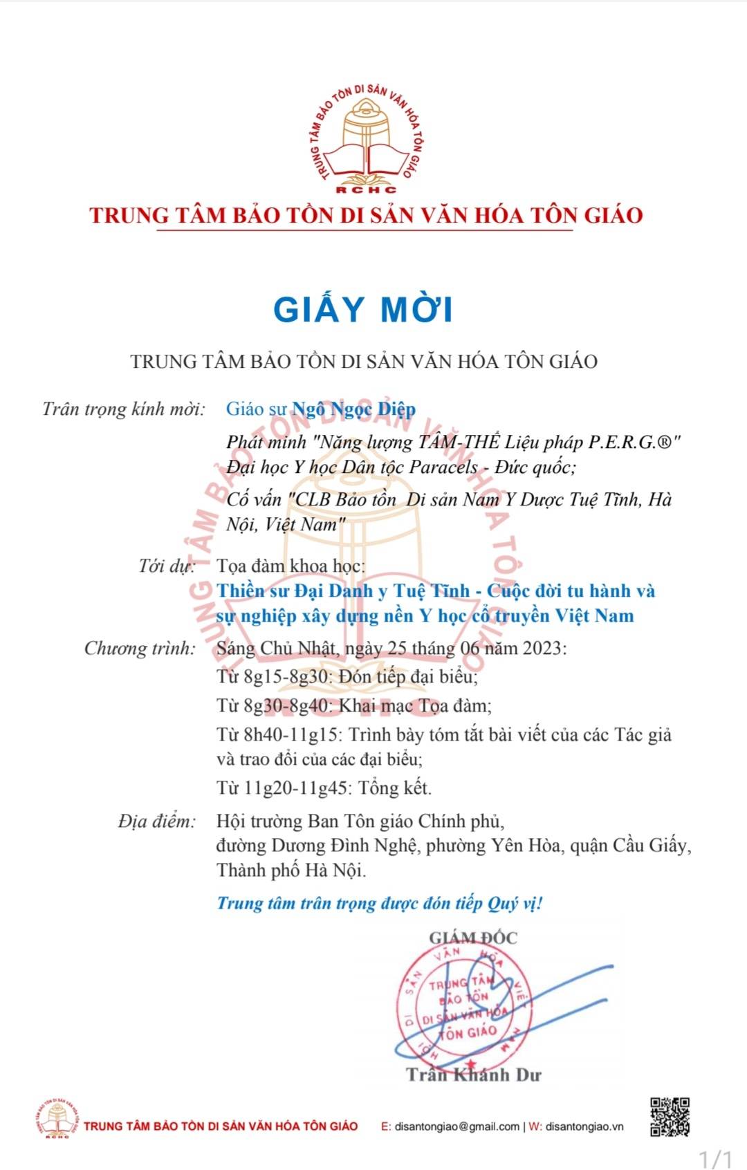 của Ban Tổ Chức Hội Thảo Khoa Học “Thiền sư Đại Danh y TUỆ TĨNH – Cuộc đời tu hành và sự nghiệp xây dựng nền Y học cổ truyền Việt Nam” vào ngày Chủ nhật 25.06.2023, tại Hội trường Ban Tôn giáo Chính phủ, đường Dương Đình Nghệ, phường Yên Hoà, quận Cầu Giấy, Thành phố Hà Nội.